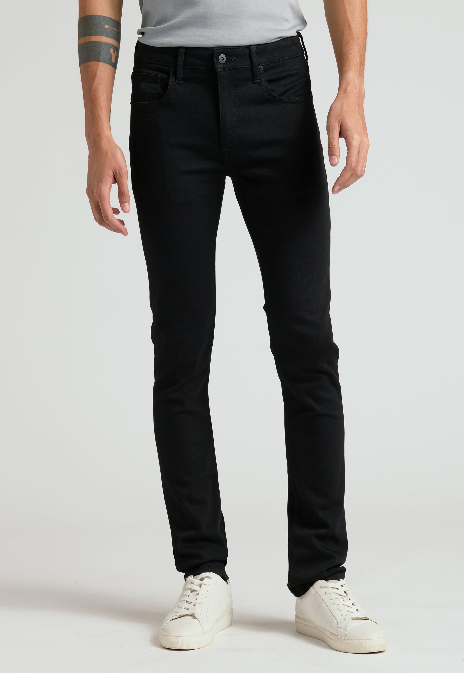 Confectionné dans un denim premium extensible et traité en "black wash", il offre une silhouette épurée tout en garantissant une souplesse naturelle à chaque pas.